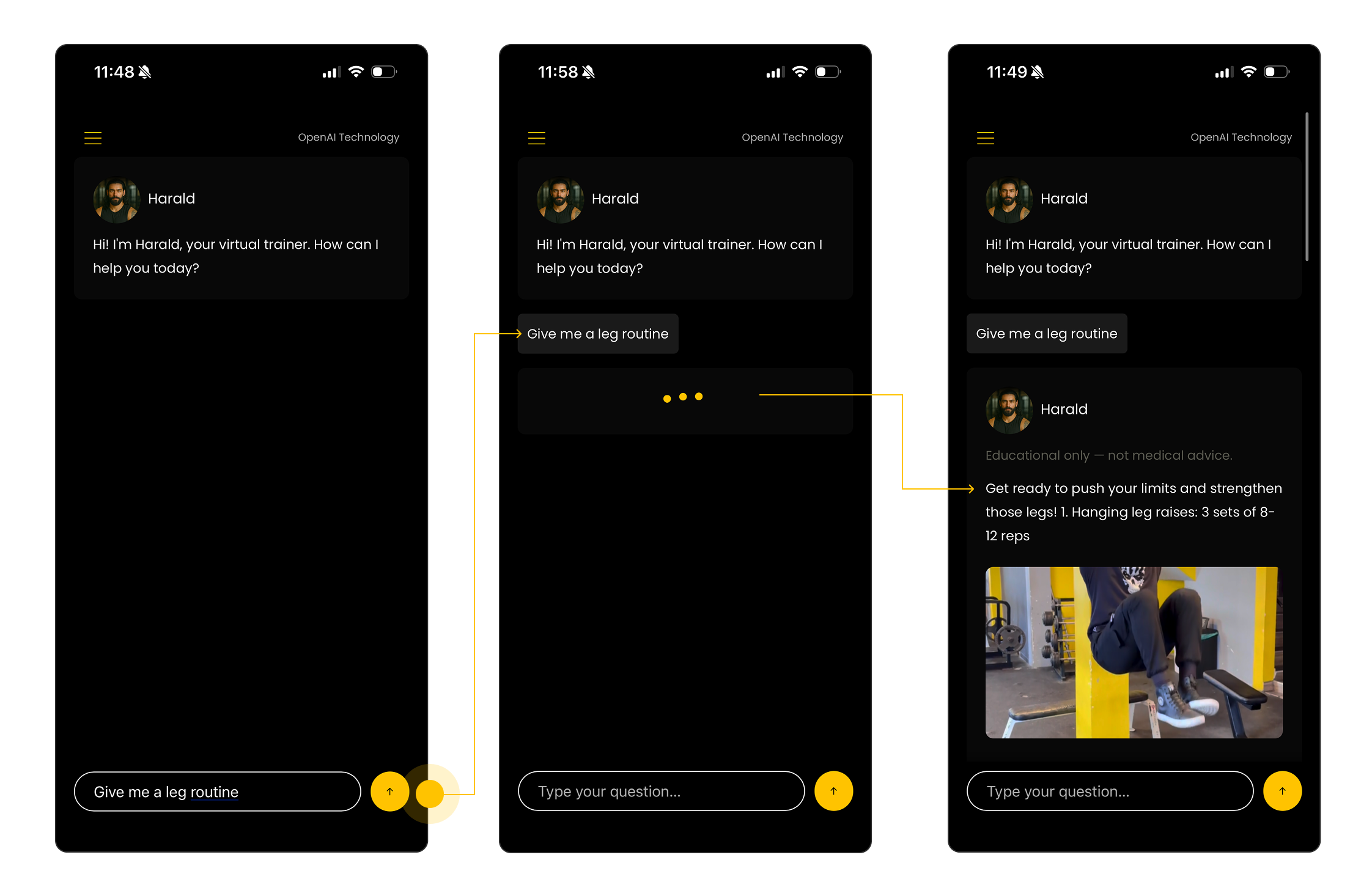 This insight fundamentally shifted the direction of the product: Gymyan needed to work in chaotic, noisy environments and provide a trace of information that users can consult. The assistant evolved from voice-first to chat-first, keeping the strengths of AI guidance while removing the biggest source of friction.
