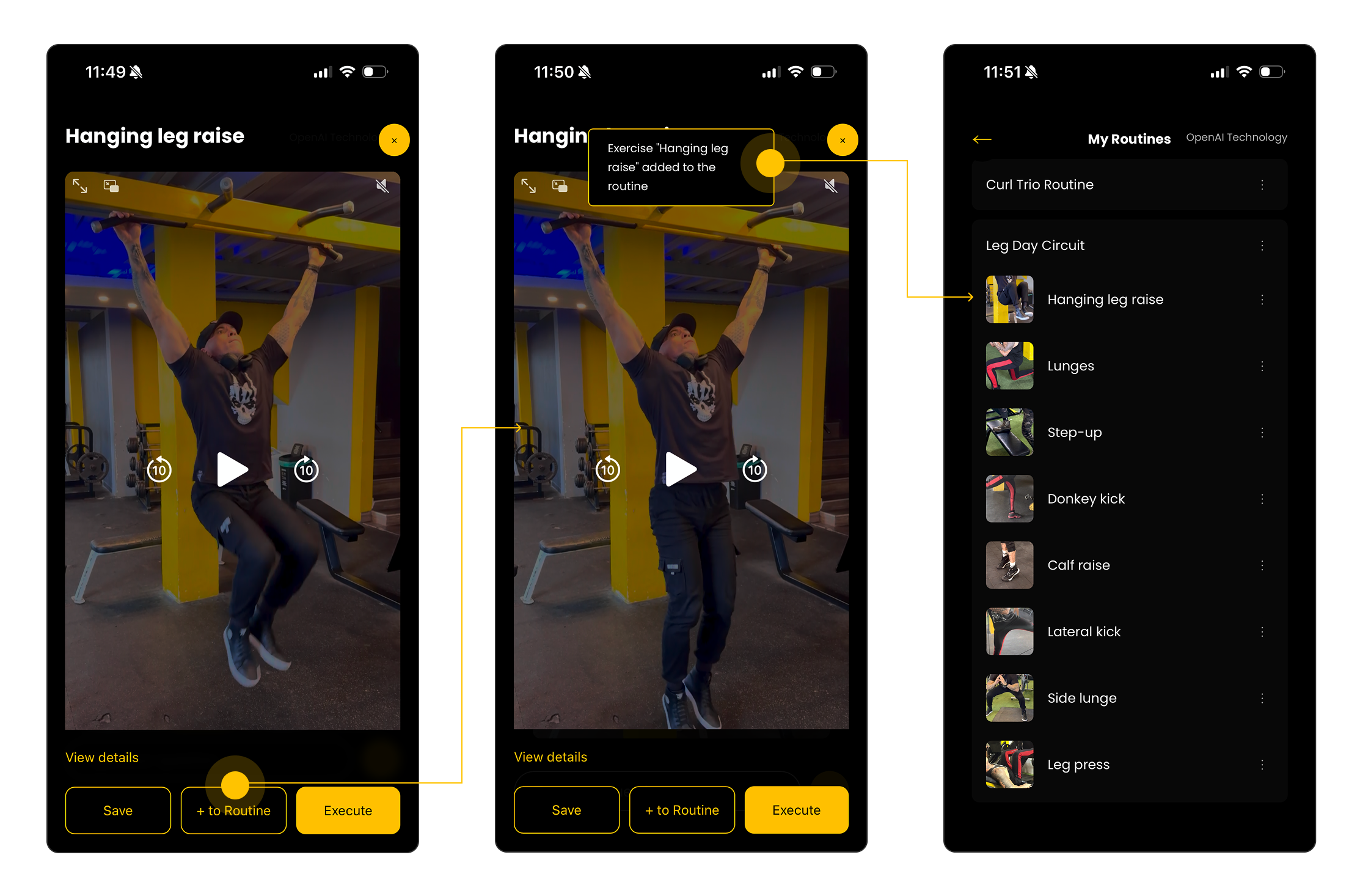 Users can save exercises and build routines to create their own library and review later. These actions enhance customization without interrupting the main training flow.