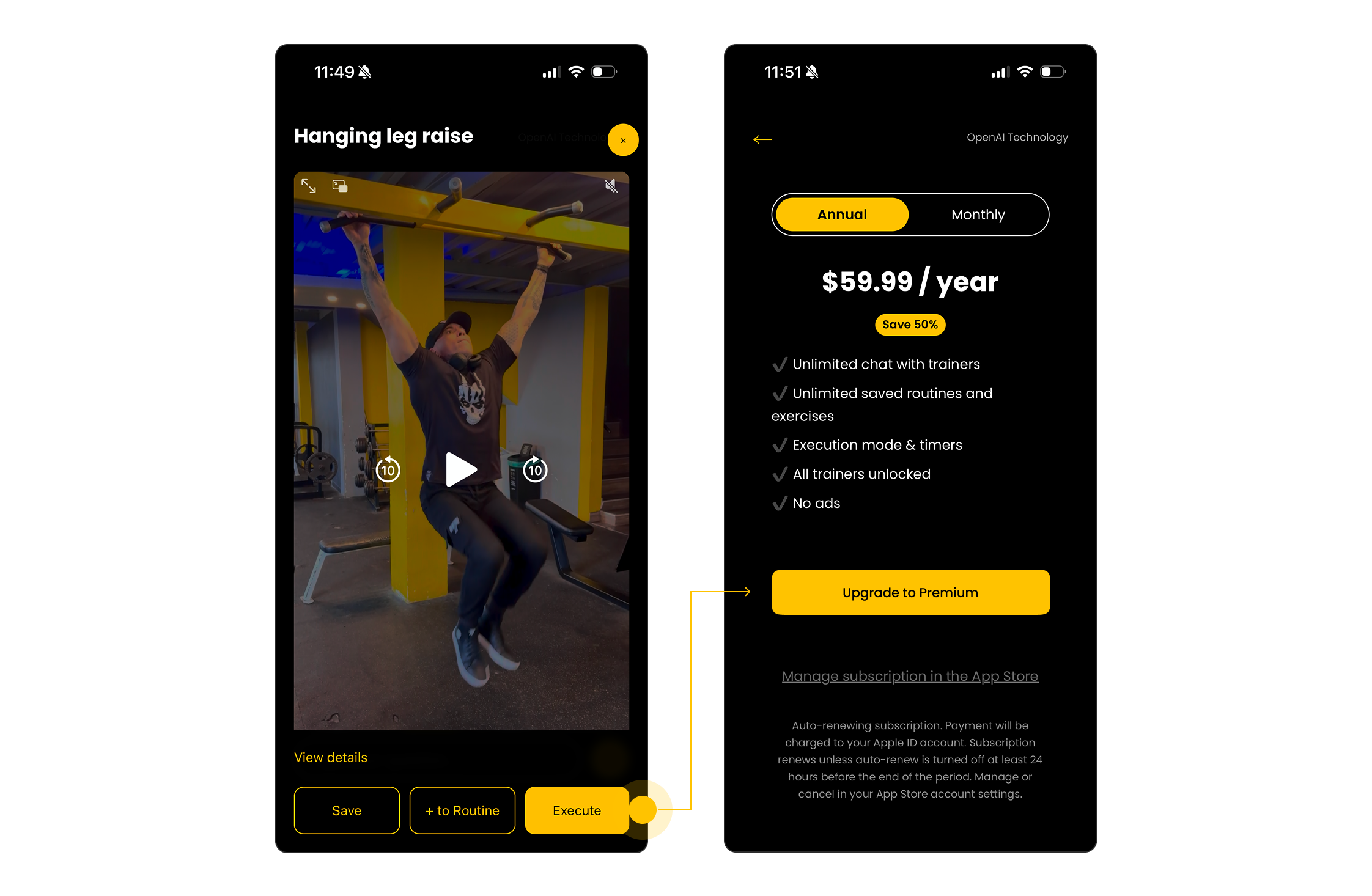 To keep the experience smooth and non-intrusive, the paywall only appears at meaningful moments, specifically when the user reaches a limit or attempts to perform a restricted action in the free tier like Execute Exercise. Instead of stopping their flow, the app informs them of the limitation and offers the option to upgrade, turning natural points of engagement into conversion opportunities without breaking the user experience.