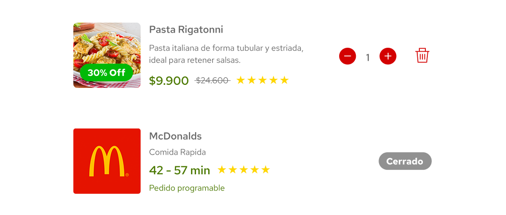 A consistent card anatomy for listings (logo/image, rating, ETA, status, price cues).