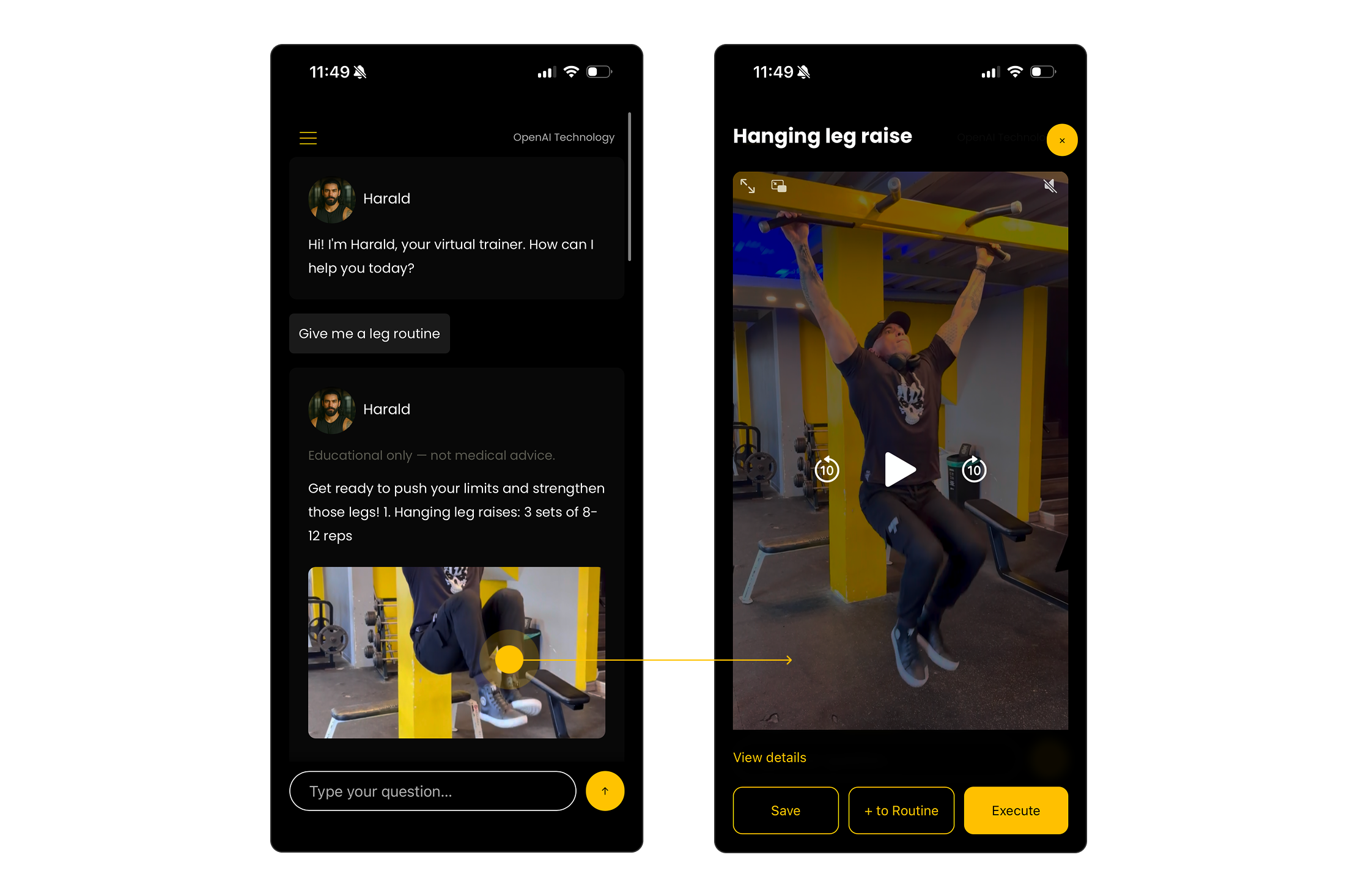 Since gym training is inherently repetitive and structured, we introduced “My Exercises”, a space where users can save relevant answers, videos, or routines and build their own reference library. This turned the assistant from a reactive chat into a growing, personalized training system the user could rely on anytime.