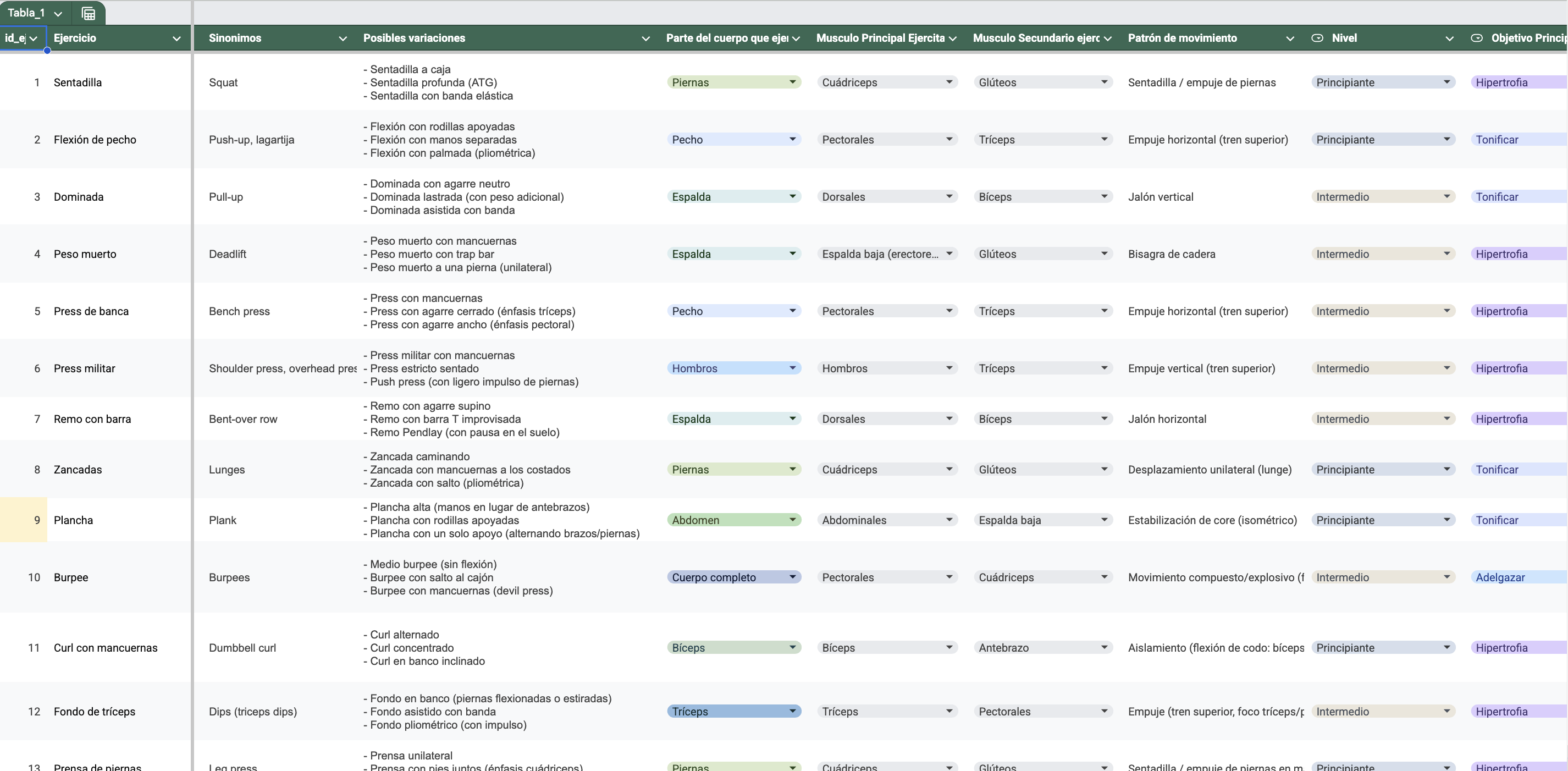 To regain control over the fitness knowledge the assistant delivered, I created a structured exercise database with my personal trainer. We documented more than 80 exercises, each with over 20 data points: names and synonyms, muscles involved, equipment type, difficulty levels, rep ranges, injury-prevention tips, and more. This became the foundation of the system’s “source of truth,” allowing the AI to generate answers grounded in curated, expert-verified information rather than the open web.